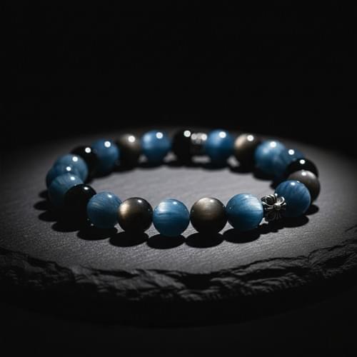 The ZenithVeil Kyanite and Silver Obsidian Bracelet symbolizes balance and inner strength. Crafted from natural kyanite and silver obsidian, this crystal bracelet perfectly blends clarity and protection, showcasing a refined and minimalist style.